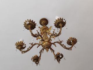 Preciosa lampara de techo de bronce con seis brazos. Es una pieza elegante y llamativa, ideal para dar un toque clásico a cualquier espacio. - Estructura de metal dorado resistente. - Perfecta para salones o comedores.