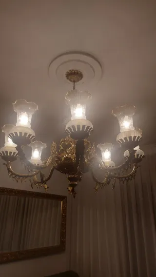Se vende espectacular lámpara de araña de estilo clásico vintage. Estructura de bronce macizo con 12 brazos para bombillas tipo vela. Decorada con lágrimas de cristal tallado que crean un efecto de luz elegante y cálido. 🔸 Perfecta para salones amplios, comedores, entradas elegantes o espacios con decoración tradicional. 🔸 Estado: Excelente, totalmente funcional. 🔸 Incluye cadena y soporte original de techo. 🔸 Medidas aproximadas: máximo 80 cm de altura y de diametro 70 cm 🔸 Se vende por cambio de decoración. 🔸 Bombillas no incluidas. Precio negociable,