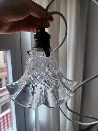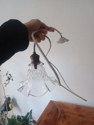 Lampara antigua con pantalla en cristal en perfectas condiciones. Soporte, polea y contrapeso en ceramica blanca. Muy buen estado. El cable es de tejido blanco, está bastante sucio pero se puede sostituir facilmente. Reperible en cualquier tienda de electricidad. Se vende limpia y desmontada. Muy facil de montar.
