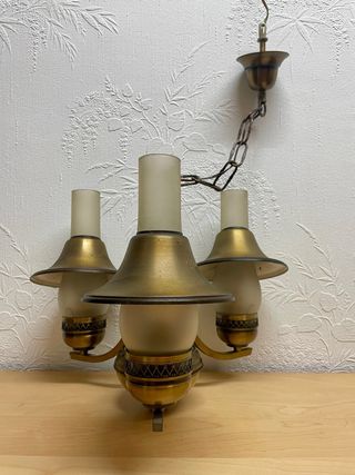Elegante lámpara antigua con detalles en metal dorado y tulipas de cristal esmerilado. - Diseño clásico con brazos curvos. - Cristal con grabado floral. - Base y detalles decorativos en metal. Fonciona perfectamente