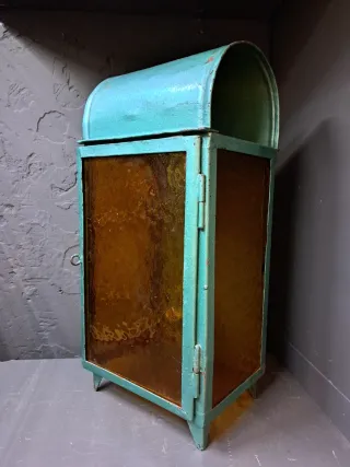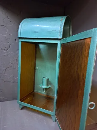 Antiguo farolillo sobremesa o pared. Puede estar en el exterior. Tiene orificio de salida trasero en el portavelas pudiendo convertirse en lampara eléctrica. Altura 47 cm x 17 cm x 21 cm.