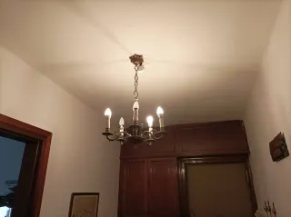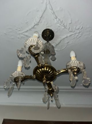 Elegante lámpara de techo estilo candelabro, con un acabado dorado que aporta un toque clásico. Funciona perfectamente!! - Diseño intrincado con detalles ornamentales. - Incorpora cristales colgantes que refractan la luz. - Base con cadena para colgar. Escucho ofertas razonables.
