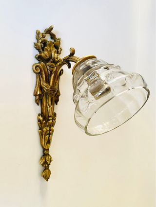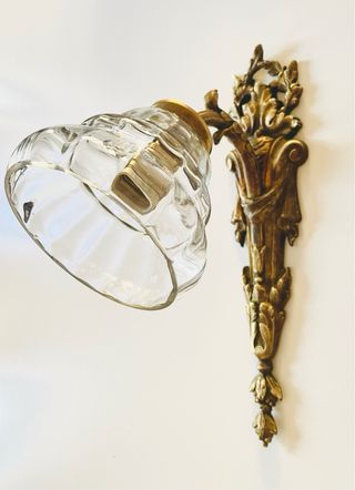 Este aplique de pared antiguo combina un diseño clásico con materiales de calidad. - Soporte de metal dorado. - Detalle de cristal tallado. - Estilo vintage.