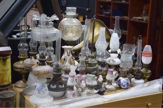 Conjunto de lámparas de aceite antiguas, perfectas para coleccionistas o decoración. - Variedad de tamaños y diseños. - Materiales como cristal y metal. - Algunos con detalles pintados a mano.