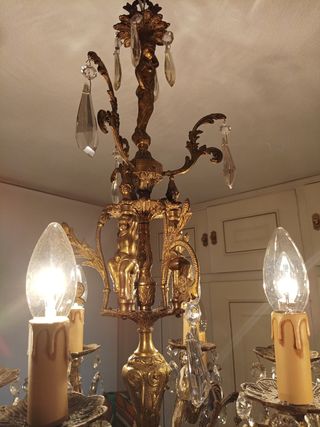 Elegante lampara antigua de bronce. Ideal para dar un toque clásico a tu hogar. - Cinco brazos con detalles de figuras aladas. - Cristales facetados colgantes. - En buen estado