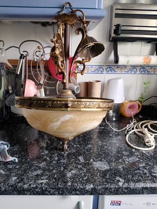 Elegante lámpara de salón con un diseño clásico y detalles ornamentales. La lámpara esta en buenas condiciones pero la parte de arriba está destrozada y no sabemos arreglarlo por eso la vendenos