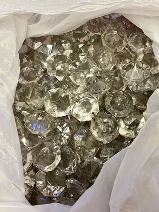 Lote de 250 octógonos de cristal, procedentes de lámparas antiguas. Están en buen estado, aunque alguno puede tener señales de uso. Son de tamaño medio, miden entre 2 y 3 cm de diámetro. Otros tamaños en mi perfil. Colgantes antiguos de cristal con forma octogonal. 250 unidades. Son alrededor de 3 kg de peso.