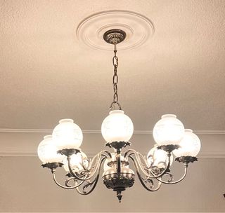 Elegantes lámpara de araña de estilo antiguo, con un diseño que combina detalles plateados y tulipas blancas. - Elaborada con materiales de cristal y metal. - Diseño clásico con múltiples brazos. - Una de ellas tiene ocho brazos - Otra de seis brazos Precio de 8 brazas 30€ Precio de 6 brazos 20€