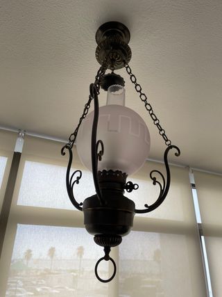 Preciosa lampara antigua de estilo clásico. Ideal para dar un toque vintage a tu hogar. - Tiene una estructura de metal con cadenas. - Lleva una pantalla de cristal opalino. - Diseño elegante y sofisticado.