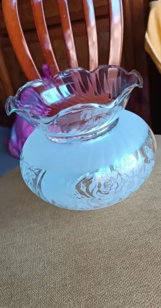 Conjunto de dos tulipas de cristal esmerilado , presenta un diseño floral grabado al ácido , la parte superior tiene un borde ondulado y un color degradado en rosa. Ideal para pantallas de mesa o techo para dar un toque . Precio de las 2 Dispongo de alguna más