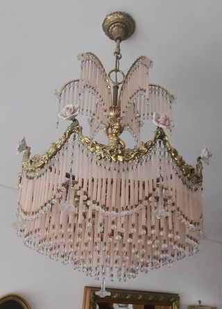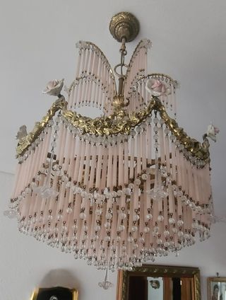 Elegante lámpara colgante con un diseño delicado y romántico. Sus detalles en porcelana y cristal le dan un toque de distinción. Recogida en Mano en Bilbao Pais Vasco. Se venden las 3 juntas - Colgantes de cristal transparente. - Elementos decorativos en forma de rosa de porcelana. - Estructura metálica dorada.