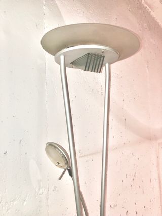 Funcional lámpara de pie con dos alturas: la inferior ideal para lectura o luz directa; la superior como luz indirecta. En color gris metalizado o cromado. En las primeras fotos los cristales están sin limpiar de estar sin usar: perdón por la presentación. El estado es el que se ve en las fotos. La luz inferior va perfectamente. La superior no (no va con led que no sea regulable), pero como último recurso se puede puentear la llave. Se puede enviar por wallapop entre Jaén y a otras provincias. Peso entre 5-10kg Más cosas en mi perfil. Medidas: Alto 180cm Diámetro 30cm