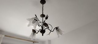 Preciosa lampara de techo con forma de rosas. Tiene seis tulipas de cristal, con detalles en rojo y blanco. La estructura es de metal, de color negro. - Elegante y decorativa. - Perfecta para iluminar cualquier estancia. - En buen estado.