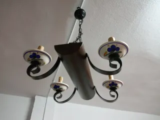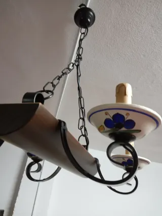 Lámpara de techo con un diseño rústico y encantador, perfecta para dar un toque especial a cualquier estancia. - Estilo forja. - Cuatro puntos de luz. - Detalle de cerámica pintada a mano con motivos florales. - Base de madera. - Cadena metálica para colgar. - No Incluye bombillas