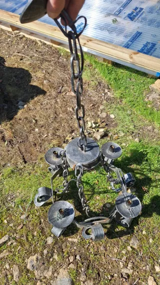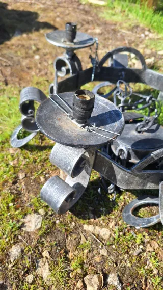 Lámpara de techo de estilo rústico, con un diseño que evoca la forja artesanal. - Estructura circular de metal. - Cadena para colgar. - Varios brazos con portalámparas.