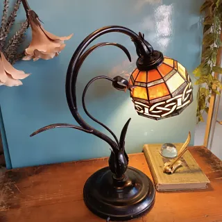 Elegante lámpara de mesa con un diseño inspirado en el estilo Tiffany. Su pie de hierro forjado le da un toque vintage y robusto. - Pantalla de cristal con detalles en tonos naranjas y blancos. - Base y estructura de metal oscuro. Alto 42 cm. Diámetro Tulipa 15 cm. Nota, sin interruptor.