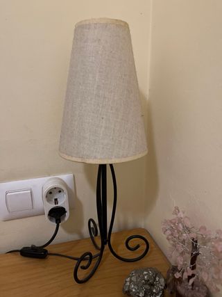 Conjunto de dos lamparitas con base de forja negra y pantalla. - Base de metal forjado color negro con diseño curvo. - Pantalla de tela en tono beige. Medida en foto