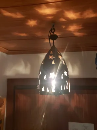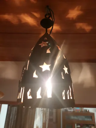 Lámpara de hierro con lunas y estrellas. Se adaptó como lámpara de techo pero és también lámpara para velas. Color hierro forjado (marrón rojizo). Estilo rústico. Alto 23cm Ancho 14cm