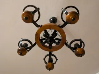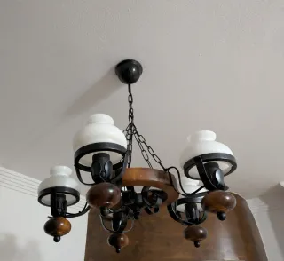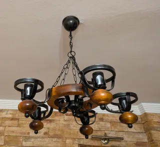 Lámpara colgante con un diseño rústico y elegante, combinando metal y madera. - Estructura principal de madera con detalles en forja. - Brazos de metal negro con remates de madera. - Cadena para colgar.