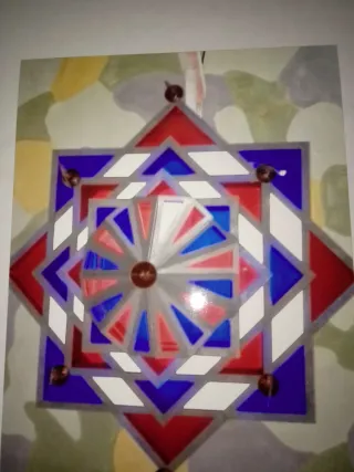 Lámpara de gran tamaño con un diseño geométrico llamativo. Combina elementos de vidrio y metal para un acabado moderno. - Diseño con múltiples capas y formas. - Patrón central radial.