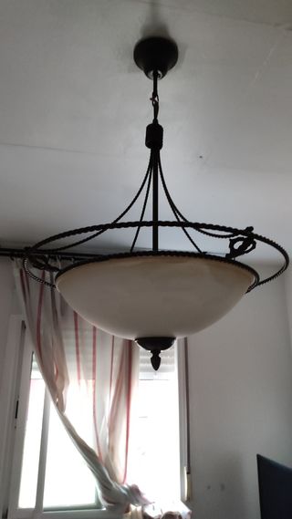 Lampara de forja de 5 brazos y 6 tulipas de cristal comprada en el Corte Ingles hace 1 año . Las 6 tulipas llevan para poner bombillas. La puedes regular en altura, añadiendo o quitando eslabones de la cadena. Las tulipas son desmontables. Está impecable porque solo ha estado colocada 1 año.