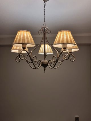 Preciosa lampara de forja con 3 brazos. Tiene un diseño elegante y sofisticado. Es de color dorado y beige, y está en buen estado. - Ideal para iluminar cualquier estancia de tu hogar. - Perfecta para crear un ambiente cálido y acogedor. - Se entrega tal cual se ve en las fotos.