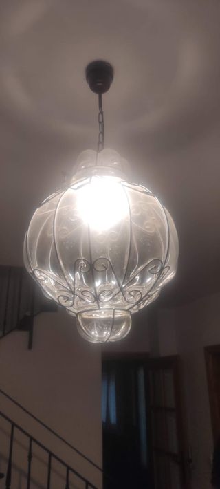 Elegante lámpara de techo con un diseño rústico y un toque vintage. Combina la calidez del hierro forjado con la transparencia y elegancia del cristal soplado. - Estructura de hierro negro. - Cristal soplado - Cuerpo principal de cristal transparente. 50 y 30 cm de diámetro aprox. Por separado, el modelo grande 35€ el pequeño 30€