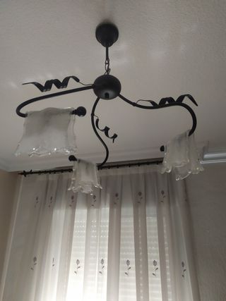 Lámpara de forja con tres brazos y tulipas de cristal. - Diseño clásico y elegante. - Ideal para dar un toque rústico a tu hogar. - En buen estado.