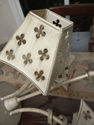 Bonita lámpara de forja beige Tres brazos con pantallas. Regalo sobremesa para mesita de noche, hay foto