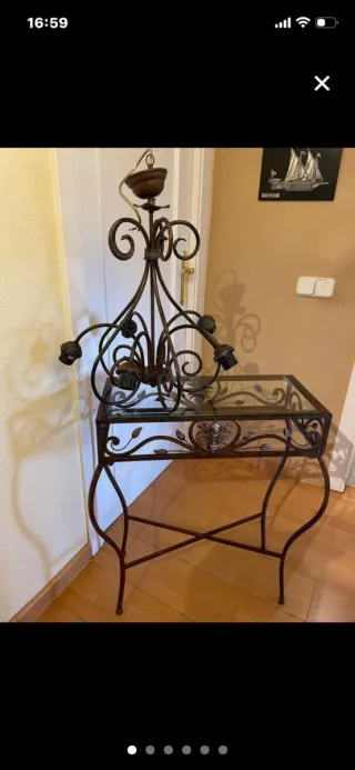 Conjunto de lámpara y mesa auxiliar con un diseño elegante en forja y cristal. - Estructura de metal con detalles ornamentales. - Superficie de cristal. - La lámpara tiene un diseño de ramas con soportes para bombillas.