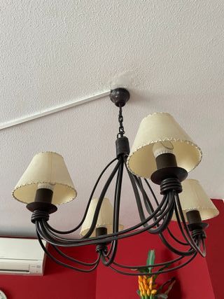 Lampara de techo con un diseño artesanal en forja. - Base y estructura de metal con detalles decorativos. - Pantallas de tela en tono beige.