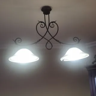 Elegante lámpara de techo con un diseño de forja y tulipas de cristal. - Estructura metálica con detalles ornamentales. - Dos tulipas de cristal translúcido. A una de las 2 tulipas le falta un trozo, ver la última foto
