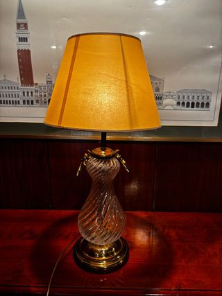 Elegante lámpara de mesa con un diseño vintage único. - Base y detalles en metal dorado. - Cuerpo de cristal transparente con espiral. - Pantalla de tela en tono ocre. Es de forja y se ha restaurado con cable electrico nuevo.