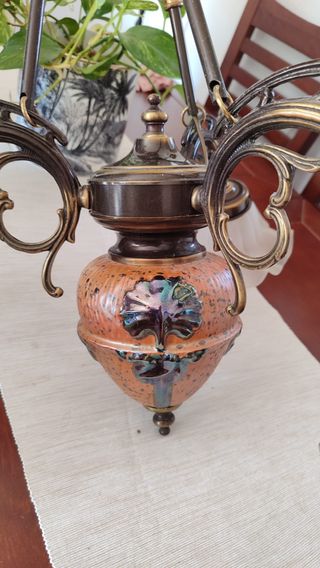 Elegante lámpara de techo con detalles en forja y cerámica. - Diseño clásico y atemporal. - Acabado en tonos dorados y marrones. - Pantallas de cristal con un diseño decorativo.