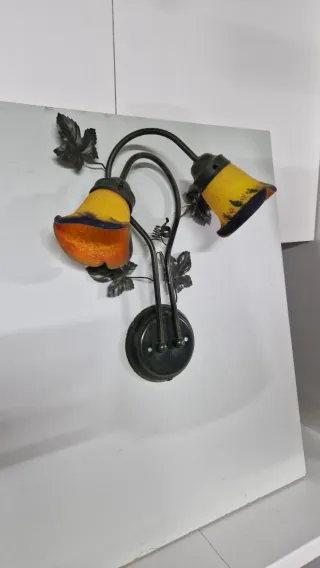 Aplique de pared estilo vintage y rústico con un diseño inspirado en la naturaleza con rizos y hojas de forja artistica. Cuenta con dos tulipas de pasta de vidrio con tonalidades naranjas y amarillas. - Estructura de hierro forjado color cobre envejecido. Casquillo E14. Medidas: 40 cm de alto por 30 cm de ancho. Tulipas de 9 cm de alto y 10 cm diámetro.