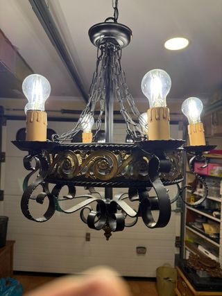 Preciosa lampara de techo de forja, estilo rústico. Ideal para dar un toque vintage a tu hogar. - 5 brazos para colocar bombillas. - Estructura circular con detalles decorativos. - Cadena de metal para colgar.
