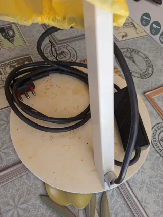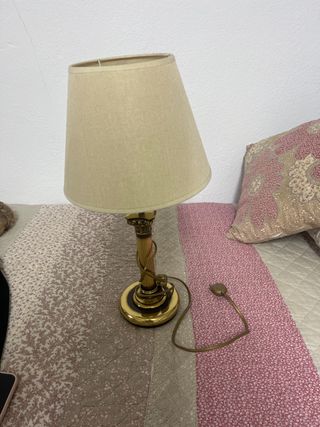Elegante lámpara de mesa con una altura aproximada de 60 cm. Su diseño combina tonos beige y dorados, aportando un toque de calidez a cualquier espacio. - Pantalla de tela. - Base y pie de plástico con acabado imitación madera.