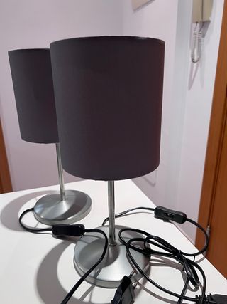 Conjunto de lámparas de mesa en buen estado. - Pantallas de tela beige con borde marrón. - Base de metal. - Diseño clásico y elegante.