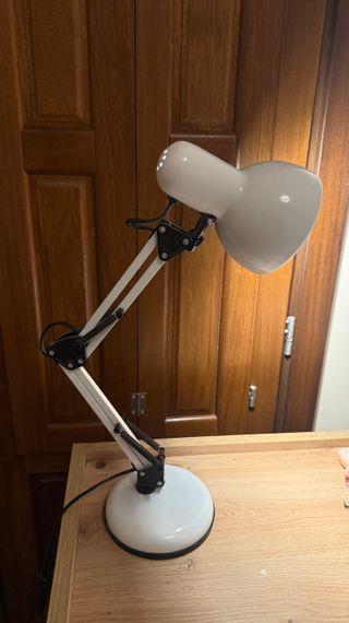 Lámpara de mesa con un diseño moderno y funcional. - Base redonda. - Brazo flexible para dirigir la luz. - Pantalla cónica.