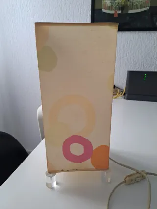 Conjunto de lámpara de mesa y lámpara de techo. - Lámpara de mesa con base cuadrada. - Lámpara de techo con pantalla cuadrada. - Elementos decorativos circulares en rosa y azul.