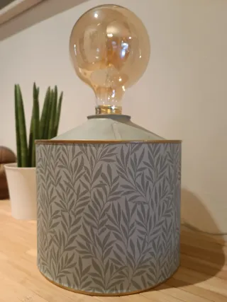 Elegante lámpara de mesa con un diseño moderno estilo industrial y un estampado de hojas. -Base de metal estampado de hojas en tonos verde vintage y detalles en dorado - Bombilla de cristal grande con filamento visto incluido. Hecha a mano