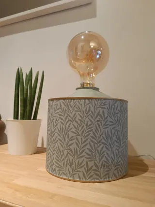 Preciosa lámpara de mesa con un diseño moderno y elegante. Aporta un toque acogedor a cualquier estancia. - Estructura de madera en la base. - Pantalla de tela con acabado en hilo. Va con pilas