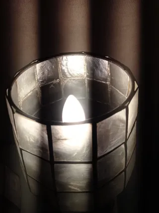 Lámpara de mesa con vela incluida, en colores plateado, blanco y transparente, de diseño original. - Base metálica. - Cuerpo con cuentas imitación de cristal. - Pantalla adornada con cuentas y colgantes.