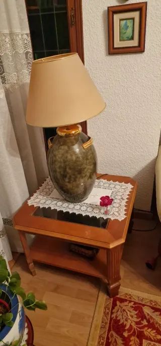 Lámpara de mesa de gran tamaño con un diseño texturizado. - Base y cuerpo de cerámica. - Pantalla de tela en tono neutro. - Mide de alto 74 cm y el diámetro de la pantalla es de 40cm. - Es de la tienda crisal decoración, nueva vale 200€. -Tiene unas marquitas por dentro de la pantalla como se puede ver en las fotos.