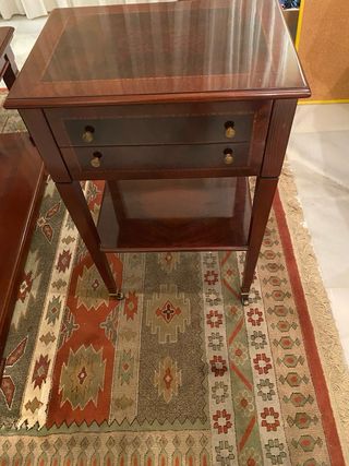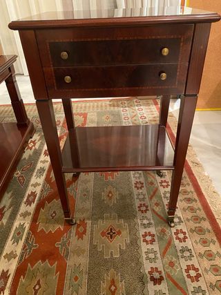 En venta preciosa mesita auxiliar de estilo clásico, ideal como mueble de entrada, mesilla de noche alta o soporte para lámpara/teléfono. Realizada en madera de alta calidad con acabados en alto brillo. • Detalles de diseño: Tapa superior y frontales de cajones decorados con finos hilos de marquetería. • Almacenamiento: Cuenta con dos cajones con tiradores circulares de latón y un estante inferior abierto para libros o decoración. • Movilidad: Incluye ruedas metálicas originales de estilo vintage que facilitan su desplazamiento sin dañar el suelo. • Estado: En perfectas condiciones, muy bien conservada y con el barniz brillante.