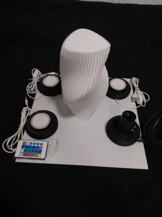 Lámpara de mesa con un diseño moderno y elegante. Ideal para dar un toque especial a cualquier espacio. - Estructura en espiral. - Base redonda. Opciones: A: Monocolor con UCB 17€ B: Tricolor con UCB 18€ C: RGB con UCB 19€ D: Portalanpara E27 clavija para 230V 20€ ( no incluye bombilla)