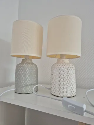 Dos lámparas de mesita de noche, una blanca y la otra gris. Base de cerámica con relieve y pantalla de tela. Para bombilla E14 max. 40W (incluye bombillas). Medidas: 15cm de diámetro y 32 de alto. Están prácticamente nuevas.