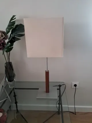 Elegante lámpara de mesa con un diseño contemporáneo que combina materiales. Aporta un toque cálido y sofisticado a cualquier espacio. - Base y detalles en madera. - Estructura metálica. - Pantalla de tela beige.
