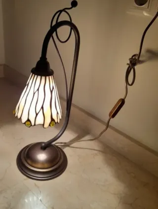 Elegante lámpara de mesa con un diseño clásico. - Base metálica con acabado en bronce y dorado. - Pantalla de cristal estilo Tiffany con detalles en blanco crema y amarillo - Curvado brazo metálico con un detalle decorativo en espiral. Apenas se ha usado, está nueva, funciona correctamente. 🌻NO HAGO ENVÍO TIENE QUE VENIR A RECOGERLO EN SAN JUAN ALICANTE