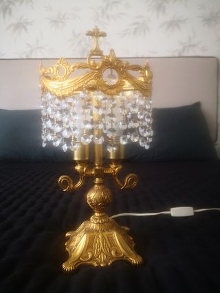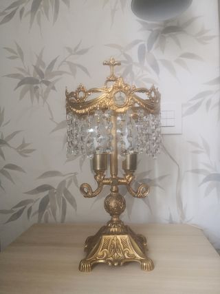 Preciosa lampara de mesa con pantalla en cristal pintado en dorado.